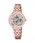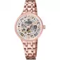 Dámske analógové hodinky s automatickým strojčekom vás upútajú na prvý pohľad. Dokonalé prevedenie okrúhleho puzdra dá nahliadnuť na pohybujúci sa strojček, ktorý chráni oceľové puzdro a minerálne sklo. Hodinky sú patrené technikou PVD vo farbe ružového zlata. Prednosťou zlatenia technológií PVD je vysoká tvrdosť a odolnosť proti oteru! Ide o hrubú vrstvu, ktorá preniká do pôvodného materiálu. Zlatenie technológií PVD sa dá porovnať s približne 12 mikrónmi galvanického zlatenia, čo je vysoká hodnota, ktorá pri bežnom nosení vydrží až 12 rokov. Indexy a ručičky sú vo farbe ružového zlata, ktoré sa dokonale dopĺňajú s farbou ocele leštenej do vysokého lesku. Doprajte si luxus a pohodlie dámskych automatických hodiniek. Už nebudete chcieť iné.