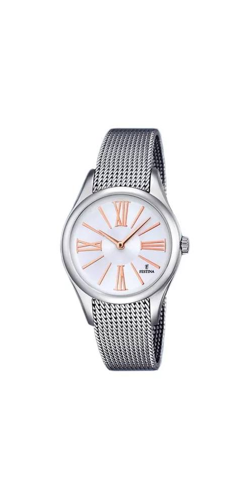 Dámske módne hodinky Festina - Trend 16962/1 v analógovom zobrazení času. Hodinky zaujmú na prvý pohľad svojim elegantným a originálnym vzhľadom. Hodinky majú oceľový remienok a ciferník okrúhleho tvaru v striebornej farbe. Vďaka tomuto celostriebornému prevedeniu sa budú hodinky hodiť na všetky príležitosti. Indexy a ručičky vo farbe ružovej zlata sa výborne dopĺňajú so strieborným ciferníkom. Švajčiarska značka hodiniek FESTÍNA vyniká svojim moderným dizajnom a prvotriednou kvalitou. A to všetko za veľmi priaznivú cenu. Dámske hodinky FESTÍNA si vyberajú ženy, ktoré vyhľadávajú luxusné hodinky s ručne brúseným tvrdeným minerálnym sklíčkom. Máme širokú ponuku najrôznejších farieb a tvarov.