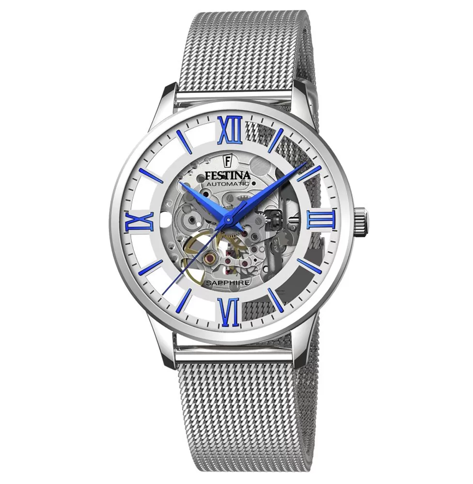 Hľadáte spoľahlivé hodinky v luxusnom dizajne? Tak to Vás upúta tento model hodiniek Festina. Analógové hodinky Automaty sú celé vyrobené z chirurgickej ocele s okrúhlym puzdrom a úžasným pohľadom na pracujúci strojček, ktoré vidíte cez zafírové sklo. Vodotesnosť u tohto modelu je 50ATM. Tieto hodinky si zamilujete. Sú dokonalým spojením luxusu a kvality.