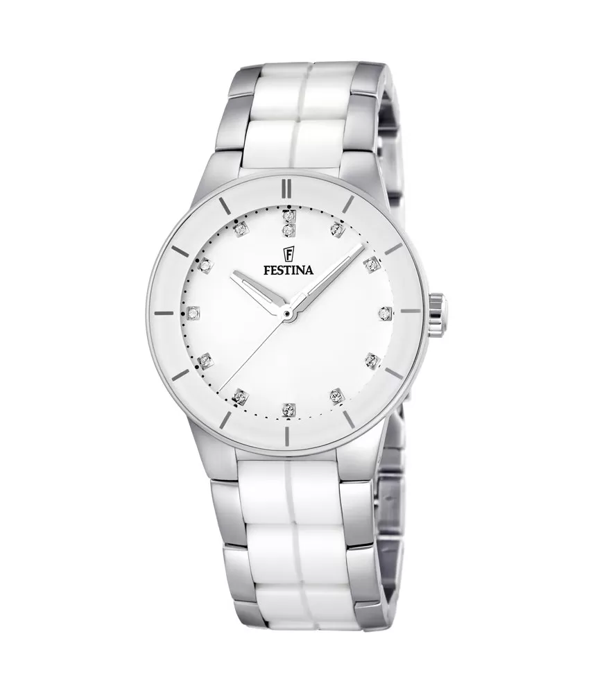 Dámske náramkové hodinky Festina z modelového radu Ceramic si zamilujete. Hodinky sú veľmi moderné a elegantné. Hodinky sú vyrobené v kombinácii keramiky a ocele. Oceľ je veľmi obľúbený materiál v hodinárskom priemysle a pýši sa vysokou odolnosťou a dlhou životnosťou. Keramika je odolná voči poškriabaniu a veľmi príjemná do ruky. Oceľ na tomto modeli je vo farbe ocele a keramika v bielej farbe.