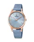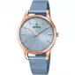 Štýlový model na každodenné nosenie poteší oceľovým puzdrom, ktoré je vybavené PVD povrchovou úpravou vo farbe ružového zlata. Ciferník je veľmi prehľadný. K dispozícii sú ručičky a indexové hodiny, ktoré sú v elegantnom dizajne. Řemínek je potažená povrchovou úpravou v modrej farbe. Každá žena miluje doplnky a šperky a tieto hodinky sa k nim dokonale hodia.