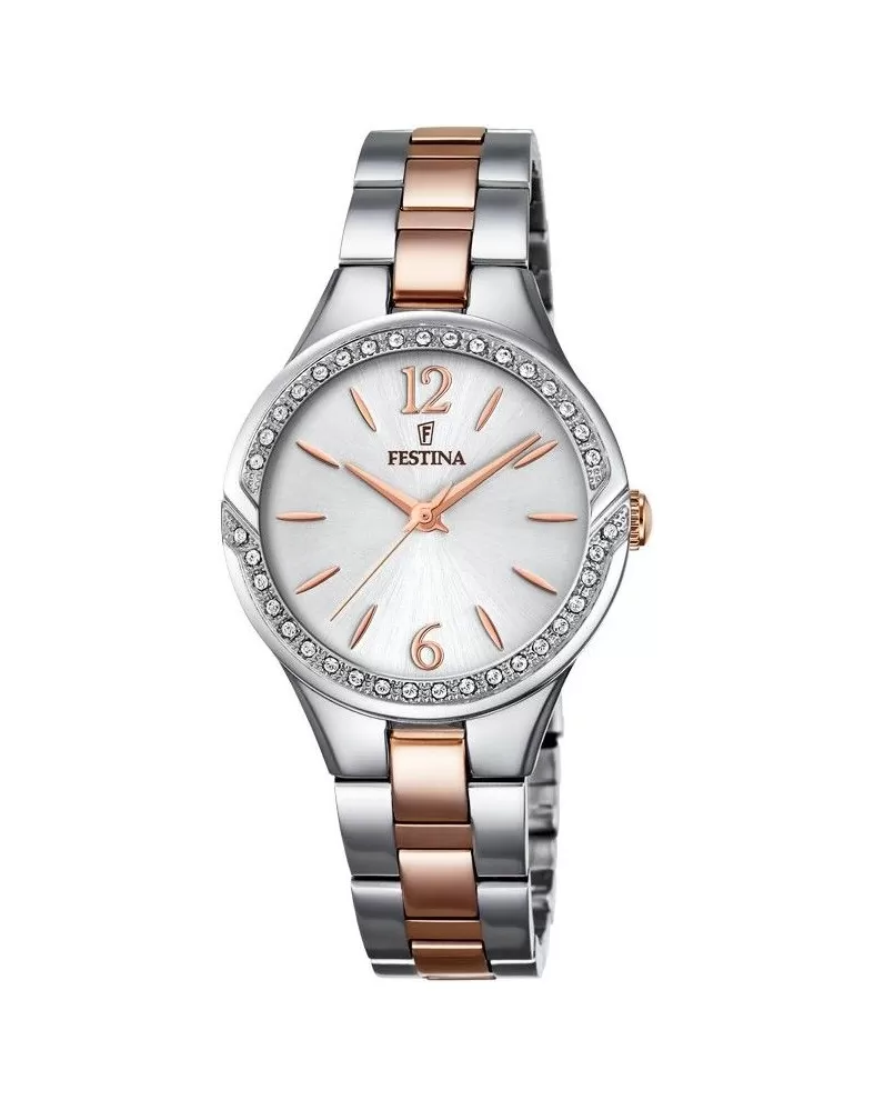 Elegantné dámske hodinky od značky Festina v celo-oceľovom prevedení s čiastočným pozlátením ružovým zlatom si zamiluje každá žena. Puzdro hodiniek je osadené bielymi žiarivými zirkónmi, ktoré rozžiaria váš vzhľad a zaujmú vaše okolie. Strieborný ciferník hodiniek je zdobený indexmi, číslicami a ručičkami vo farbe ružového zlata. Hodinky sú vhodné na bežné denné nosenie aj do spoločnosti.
