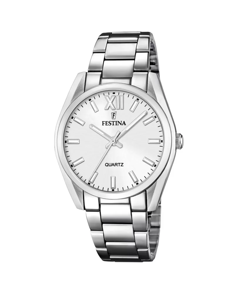 Klasické hodinky Festina sú vyrobené z chirurgickej ocele, ktorá je známa svojimi skvelými vlastnosťami. Oceľ je veľmi pevná, húževnatá a antialergická. Tento model dámskych hodiniek poteší ženy čo si nepotrpia na výstredné doplnky a hľadajú hlavne praktickosť a eleganciu. Hodinky majú okrúhle puzdro s bielym ciferníkom a hladkými indexmi hodín. Indexy hodín aj ručičky majú luminiscenčnú vrstvu, ktorá poslúži pri sledovaní času v noci. Hodinky sa zapínajú na preklápaciu sponu.