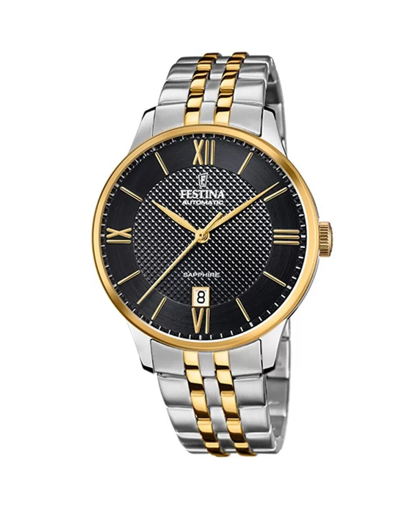 Hľadáte pohodlné automatické hodinky? Potešia vás tieto hodinky s kruhovým oceľovým puzdrom, ktoré ukrýva mechanický strojček na automatické naťahovanie, pohyb ručičky pri bežnom nosení zaisťuje neustále naťahovanie hodiniek. Prehľadný ciferník obsahuje zvýraznené hodinové indexy a zlaté rímske číslice, ktorých súčasťou sú aj hodinové ručičky. Na ciferníku je aj dátumovka na pozícii šiestej hodiny. Celý model je doplnený oceľovým remienkom v kombinácii s PVD zlátením.