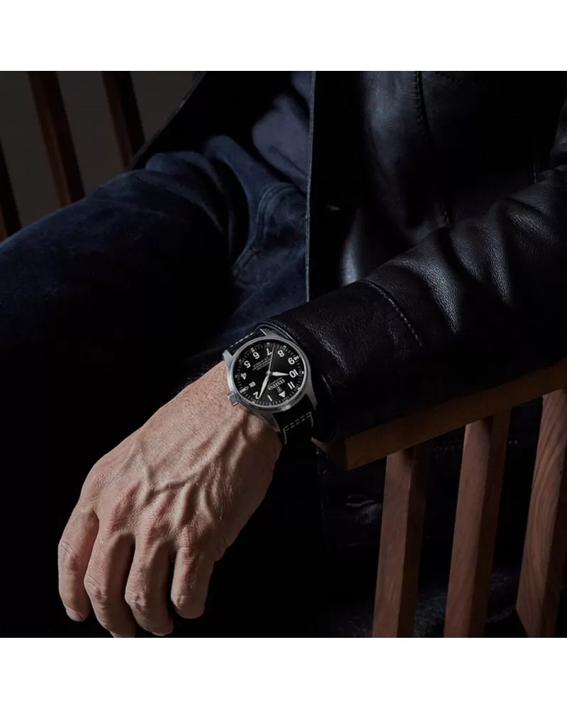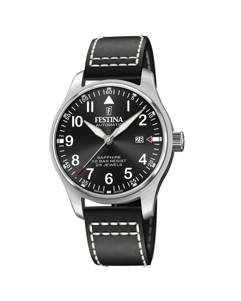 Pilotné hodinky s vodotesnosťou 10 ATM so zafírovým sklíčkom. Oceľové puzdro s koženým remienkom s kontrastným prešívaním. Chod hodiniek zaisťuje automatický strojček ETA 2824 s funkciou ukazovateľa dátumu a rezervou chodu 48 hodín.