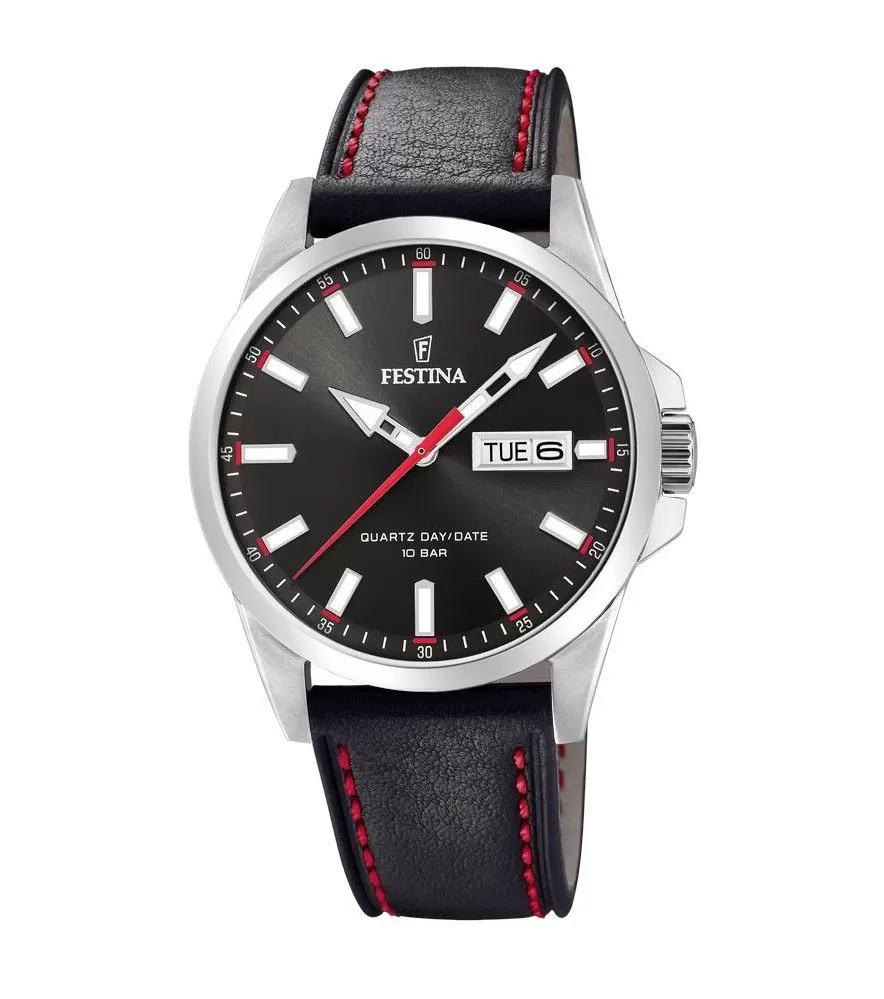 Kombinované pánske hodinky značky Festina s čiernym ciferníkom. Hodinky sa pýšia vysokou odolnosťou a dlhou životnosťou a to vďaka použitému materiálu, ktorou je nerezová oceľ, a pohodlnosťou po celý deň, vďaka koženému remienku. Hodinky majú luminiscenčné ručičky a indexy na pozícii 3 hodiny dátumovník a ukazovateľ dátumu. Na prvý pohľad vás zaujme výrazná sekundová ručička, ktorá je červená a na čiernom podklade krásne vynikne. Navyše sa ručička hodí k červenej nitke, ktorou je zošit remienok. Vodotesnosť tohto modelu je pod označením 100M do hĺbky 8 metrov.