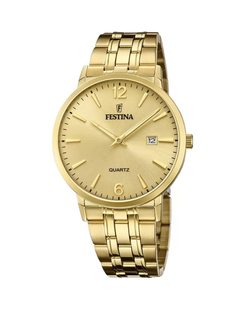 Pre klasika klasické hodinky Festina. Hodinky sú vyrobené z nerezovej ocele v čistej línii. Oceľ je opatrená povrchovou úpravou PVD vo farbe žltého zlata. Ciferník obsahuje rímske zlaté číslice a dátum, ktorý je umiestnený na pozícii troch hodín