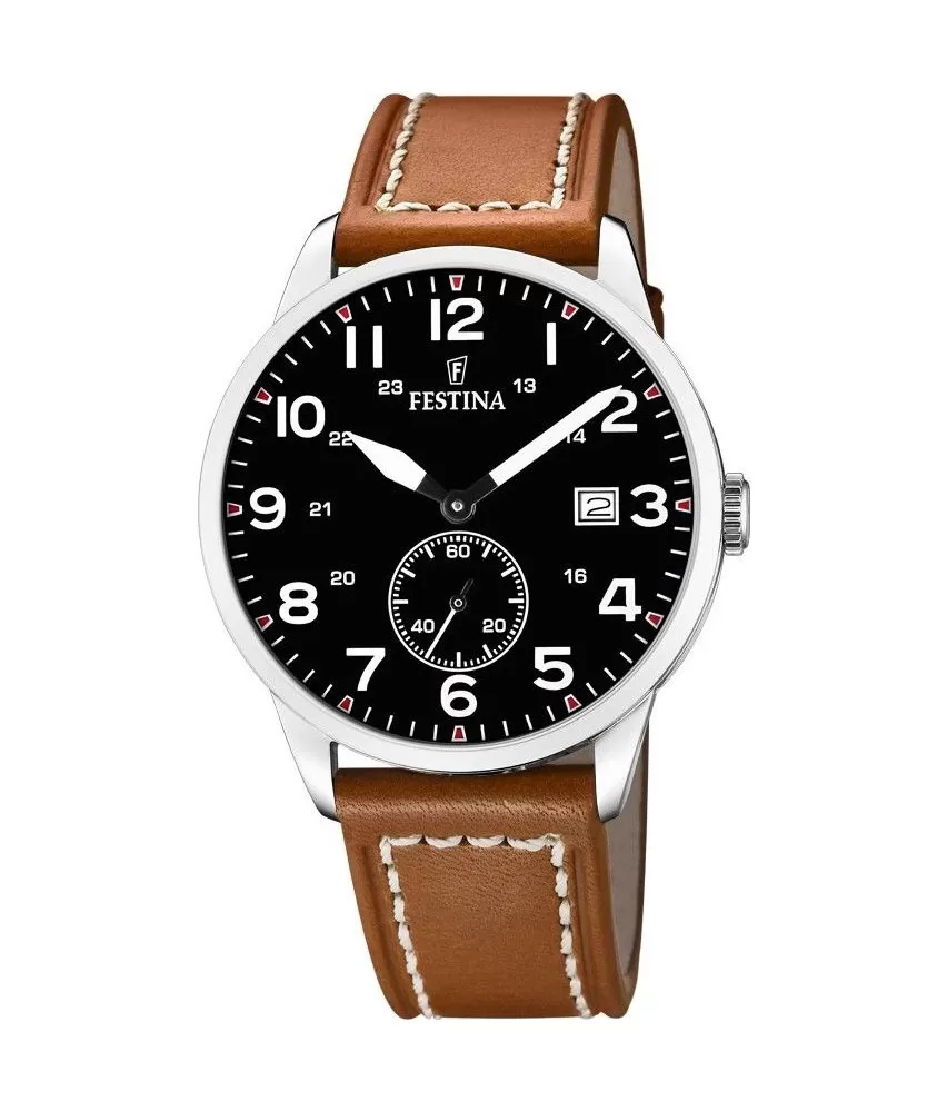 Pánske športové hodinky FestinaBox20347/7s oceľovým puzdrom a svetlohnedým koženým remienkom si zamiluje každý muž. Na čiernom ciferníku vynikajú biele ručičky a indexy. Hodinky majú ukazovateľ dátumu na pozícii tretej hodiny. Hodinky sú vhodné na šport, ale aj na bežný deň.