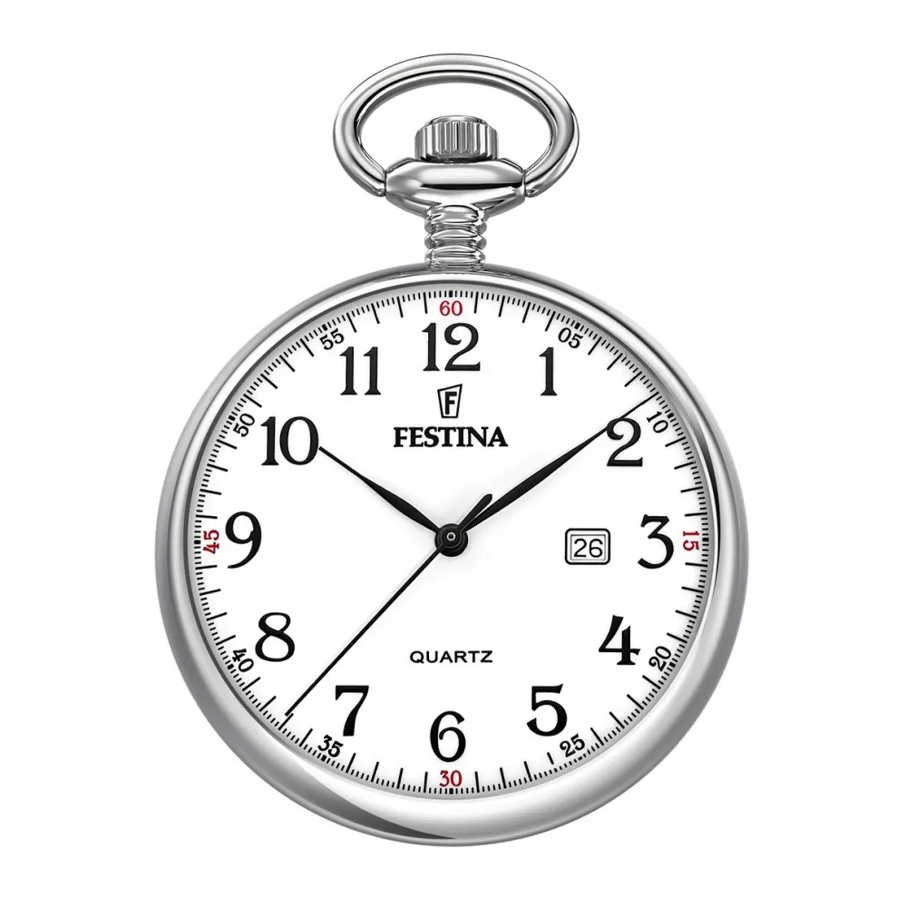 Vreckové hodinky značky Festina s oceľovým puzdrom Vás zaujmú svojim čitateľným ciferníkom s čiernymi číslicami, indexmi a ručičkami. Na pozícii tretej hodiny majú hodinky ukazovateľ dátumu.