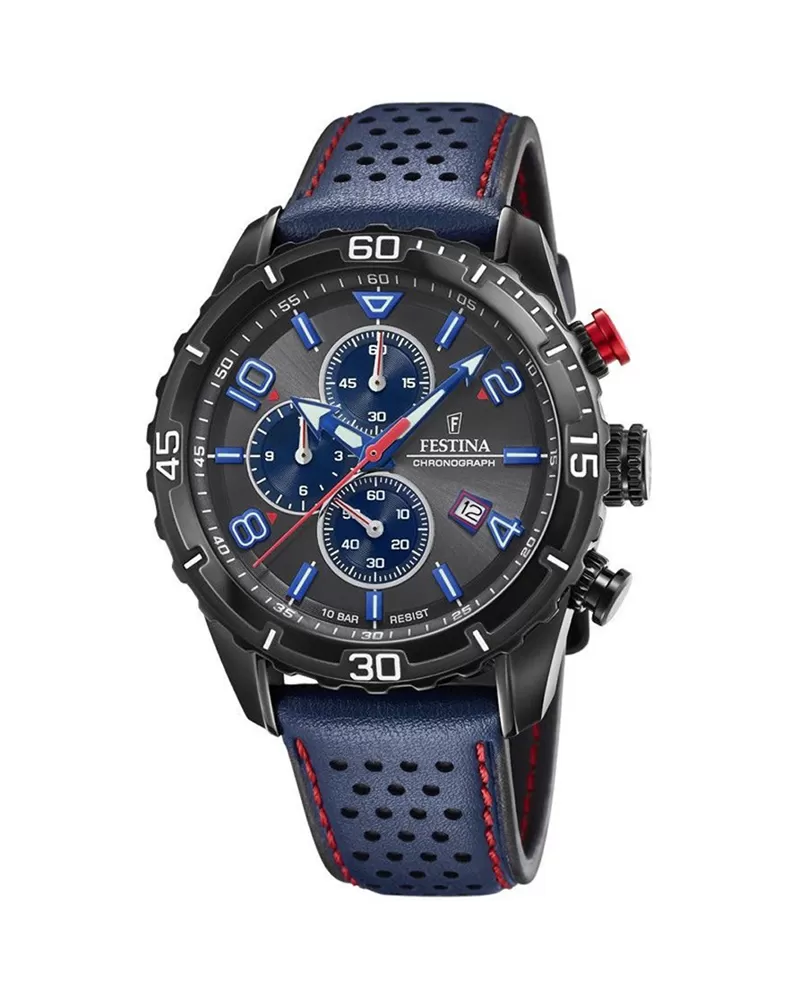 Aj športovci si potrpia na dizajn a práve pre nich tu je tento nový model, ktorý neprehliadnete. Hodinky majú okrúhle oceľové puzdro potiahnuté PVD čiernou povrchovou úpravou. Puzdro zdobí funkčná luneta a dizajnovo vyladená korunka a tlačidlá na ovládanie chronografu. Ciferník chráni minerálne sklo a môže sa pýšiť tromi ciferníkmi a dátumom, ktorý je na pozícii štyroch hodín. Pre dokonalé pohodlie je remienok z luxusnej kože.