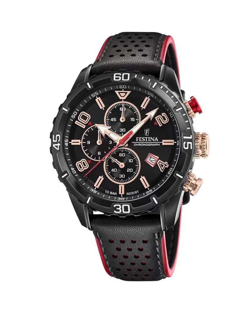 Aj športovci si potrpia na dizajn a práve pre nich tu je tento nový model, ktorý neprehliadnete. Hodinky majú okrúhle oceľové puzdro potiahnuté PVD čiernou povrchovou úpravou. Puzdro zdobí funkčná luneta a dizajnovo vyladená korunka a tlačidlá na ovládanie chronografu. Ciferník chráni minerálne sklo a môže sa pýšiť tromi ciferníkmi a dátumom, ktorý je na pozícii štyroch hodín. Pre dokonalé pohodlie je remienok z luxusnej kože.