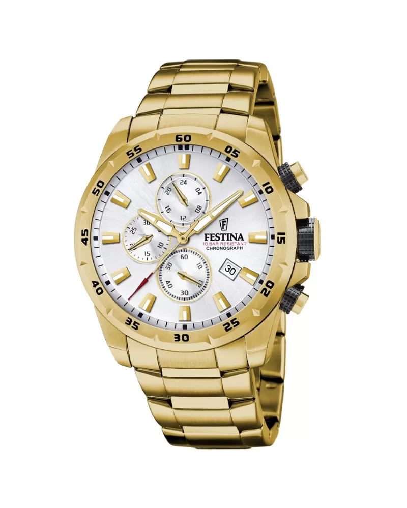 Pánske hodinky s chronografom z ušľachtilej ocele pozlátené technológiou PVD. Vďaka vodotesnosti 10 Atm sa môžete s hodinkami potápať bez prístroja.