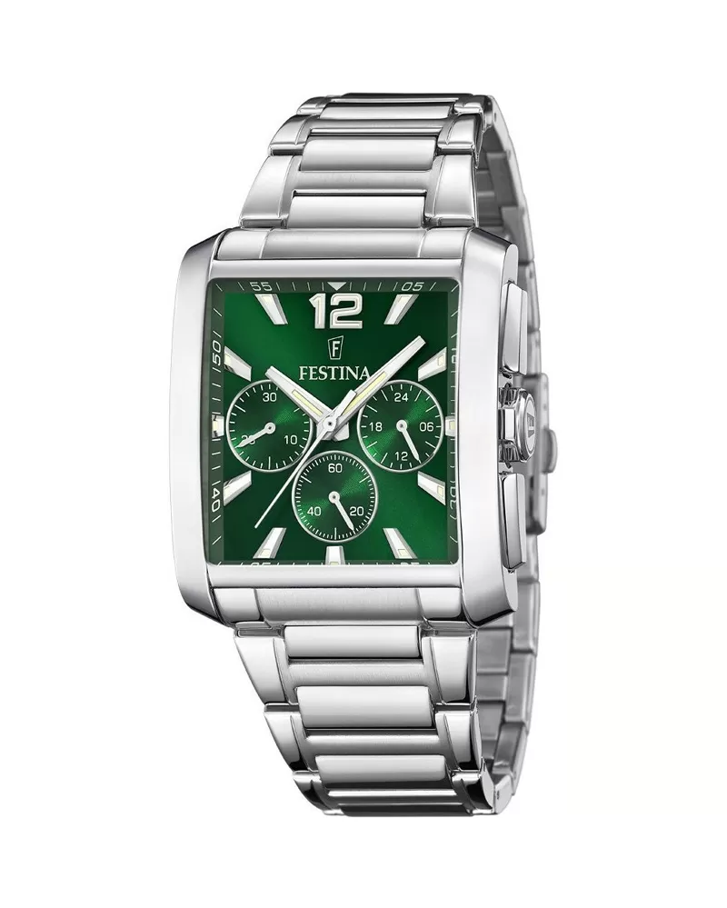 Športová kolekcia hodiniek Festina s chronografmi. Hodinky majú netradičné obdĺžnikové puzdro chránené minerálnym sklíčkom ak tomu remienok z ocele, ktorá vyniká svojou odolnosťou a tvrdosťou.