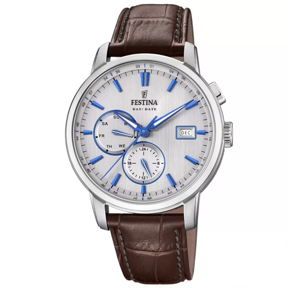 Športový model z kolekcie Timeless Chronograph 20280/2 obľúbenej značky FESTINA pre mužov. Hodinky budú štýlovým doplnkom do spoločnosti, na každodenné nosenie aj na šport. Hodinky sa dodávajú s hnedým koženým remienkom a majú aj deň v týždni, mesiac a 24-hodinový ciferník.