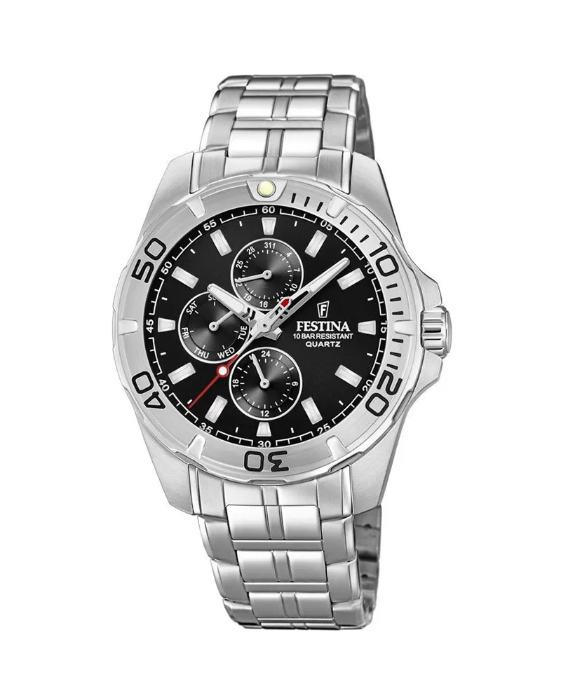 Multifunkčný model značky Festina je určený pre športovcov, ktorí hľadajú odolný kúsok do svojej zbierky. Hodinky sú celé vyrobené z nerezovej ocele, ktorá sa pýši vysokou odolnosťou a dlhou životnosťou. Pod označením 100M sú hodinky vodotesné až do hĺbky 8 metrov. Ciferník je chránený minerálnym sklíčkom a disponuje jednoduchými indexmi hodín. Ručičky aj indexy sú potiahnuté luminiscenčnou vrstvou pre lepšiu viditeľnosť v tmavej miestnosti. Sub-ciferníky hodiniek disponujú ukazovateľmi dátumu, dňa v týždni.