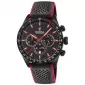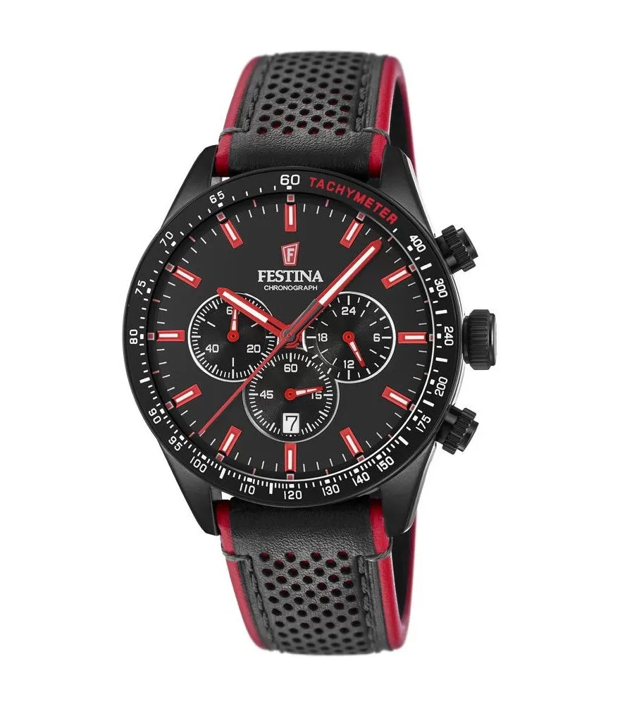 Športový model pánskych hodiniek značky Festina, ktorý si obľúbi každý muž. Hodinky majú oceľové puzdro s PVD úpravou do čiernej farby a kožený remienok v čiernej farbe. Vďaka remienku budú hodinky pohodlným doplnkom po celý deň. Čierny ciferník hodiniek zdobia červené indexy, ktoré sú spoločne s červenými ručičkami pokryté luminiscenčnou vrstvou. Ďalej je ciferník obohatený o tri sub-ciferníky s funkciou stopiek a dátumovkou umiestnenou na pozícii 6 hodiny. Hodinky sú pod označením 50M vodotesné do hĺbky 0,5 metrov.