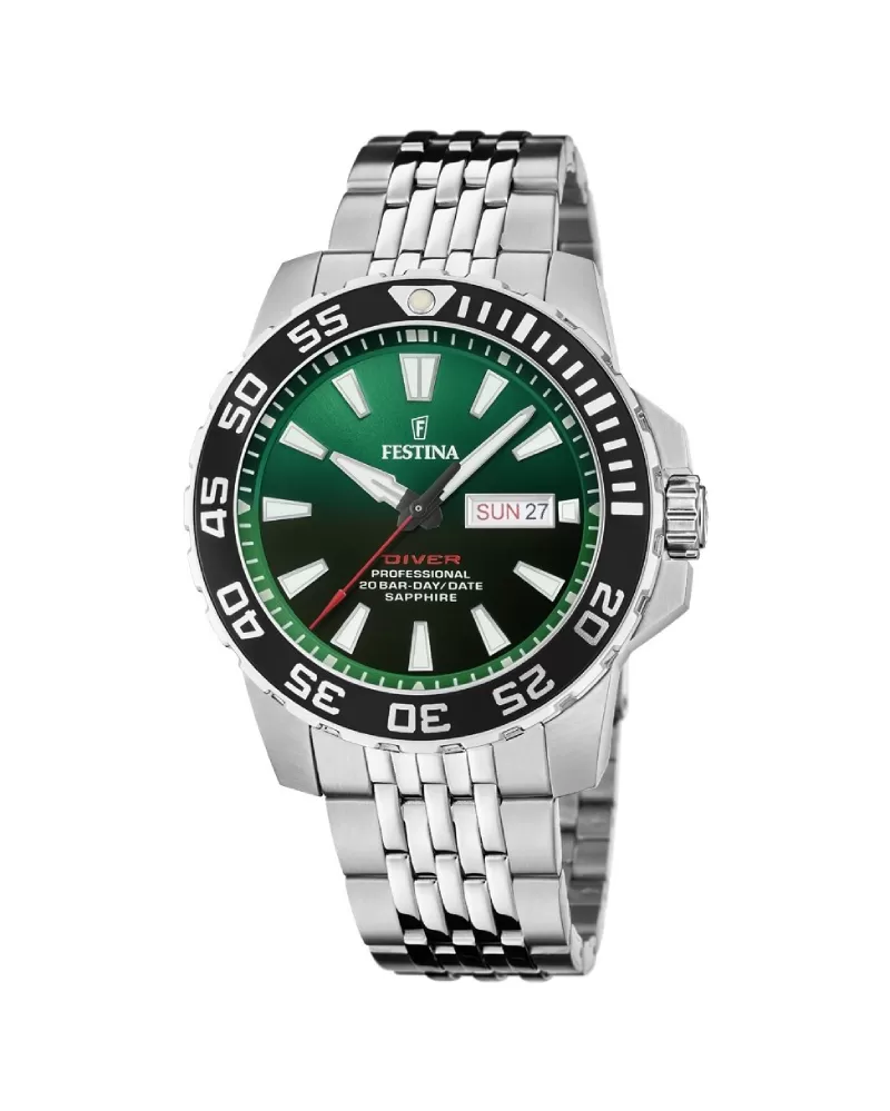 Pánske quartzové hodinky, ktoré majú dátumovku s dňom v týždni. Vodotesnosť je 20 ATM, takže sú hodinky vhodné na potápanie do hĺbky 50 metrov. Hodinky majú zafírové sklíčko.