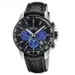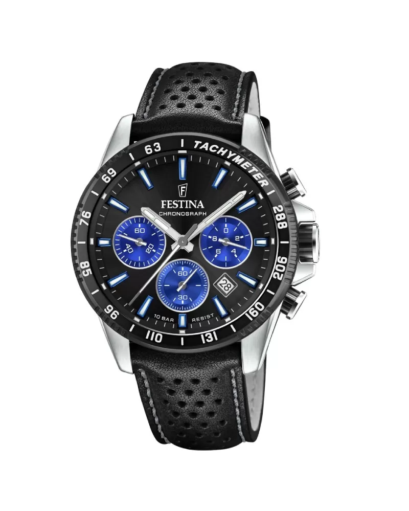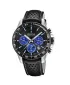Pánske quartzové hodinky s čiernym koženým remienkom sú vhodné na plávanie aj šnorchlovanie vďaka vodotenosti 100 metrov. Disponujú funkciou stopiek, dátumovkou a tachymetrickou stupnicou na lunete.