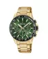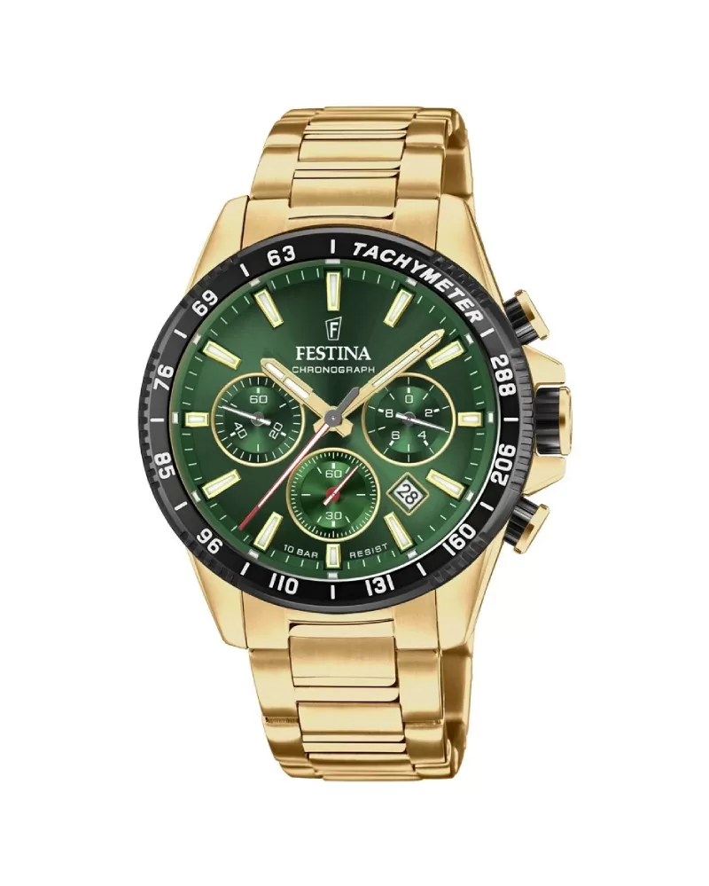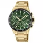 Pánske quartzové hodinky v celo oceľovom prevedení, ktoré disponujú funkciou stopiek, dátumom, tachymetrickou stupnicou na lunete a vodotesnosťou 100 metrov. Zelený číselník so zlatými indexmi je doplnený minerálnym sklom.