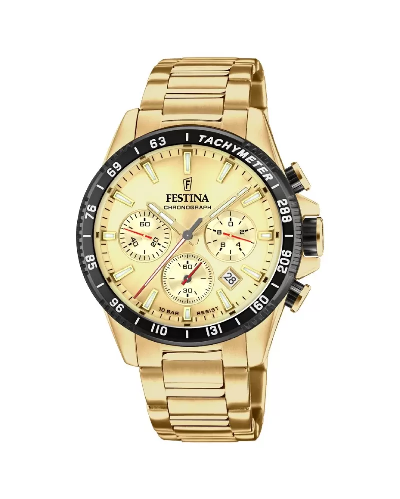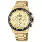 Pánske quartzové hodinky v celo oceľovom prevedení, ktoré disponujú funkciou stopiek, dátumom, tachymetrickou stupnicou na lunete a vodotesnosťou 100 metrov. Zlatý číselník so zlatými indexmi je doplnený minerálnym sklom.