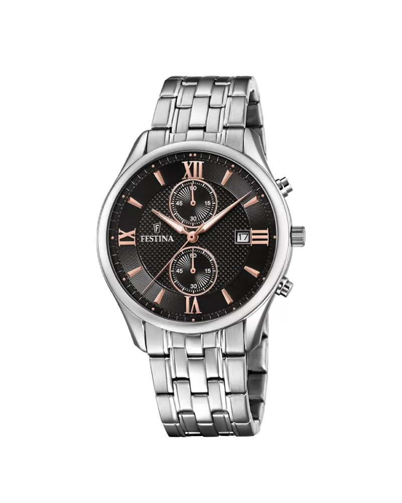 Značka Festina sa pýši viac ako storočnou tradíciou na svetovom trhu, ktorá začína roku 1902 v jednej švajčiarskej hodinárskej manufaktúre v mestečku La Chaux de Fonds. Venovala sa výrobe mechanických hodiniek a to do roku 1984, kedy značku prevzal Miguel Rodriquez a začal aj so stojkami quartzovými. Teraz je značka Festina súčasťou skupiny Festina Group so sídlom v Barcelone a s výrobnými centrami vo Švajčiarsku, Španielsku a Ázii. Svoje hodinky dodáva do hodinárstva po celom svete. Do povedomia zákazníkov sa zapísala predovšetkým modelovým radom Tour de France. Festina Vám však môže ponúknuť celé spektrum dámskych aj pánskych modelov od športových, ako je rad Tour de France, tak aj elegantná kolekcia ako je Mademoiselle. Hodinky značky FESTINA nikdy nezameníte s inou značkou. Sú originálne, nápadité a budú zároveň aj dokonalým šperkom. Švajčiarska značka hodiniek FESTINA vyniká svojim moderným dizajnom a prvotriednou kvalitou. A to všetko za veľmi priaznivú cenu.