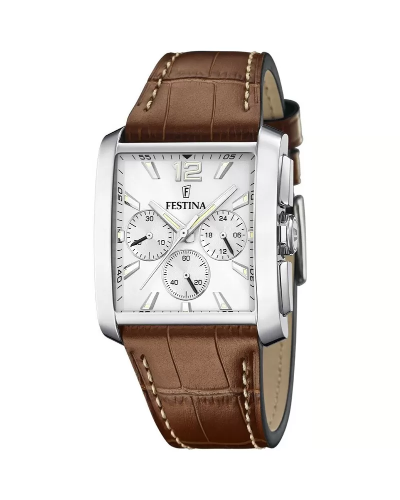 Športová kolekcia hodiniek Festina s chronografmi. Hodinky majú netradičné obdĺžnikové puzdro chránené minerálnym sklíčkom spolu s koženým remienkom, ktorý podčiarkne elegantný štýl hodiniek.