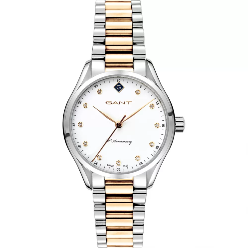 Moderné dámske hodinkyGANT Sharon 39 G139001v nerezovom prevedení s čiastočným PVD zlátením. Hodinky zdobí prehľadný strieborný ciferník so zlatými indexmi, ktoré sú navyše ozdobené žiarivými kamienkami. Tieto hodinky doplnia Vašu kolekciu hodiniek o nádherný kúsok. Stavte na tento model hodiniek GANT.