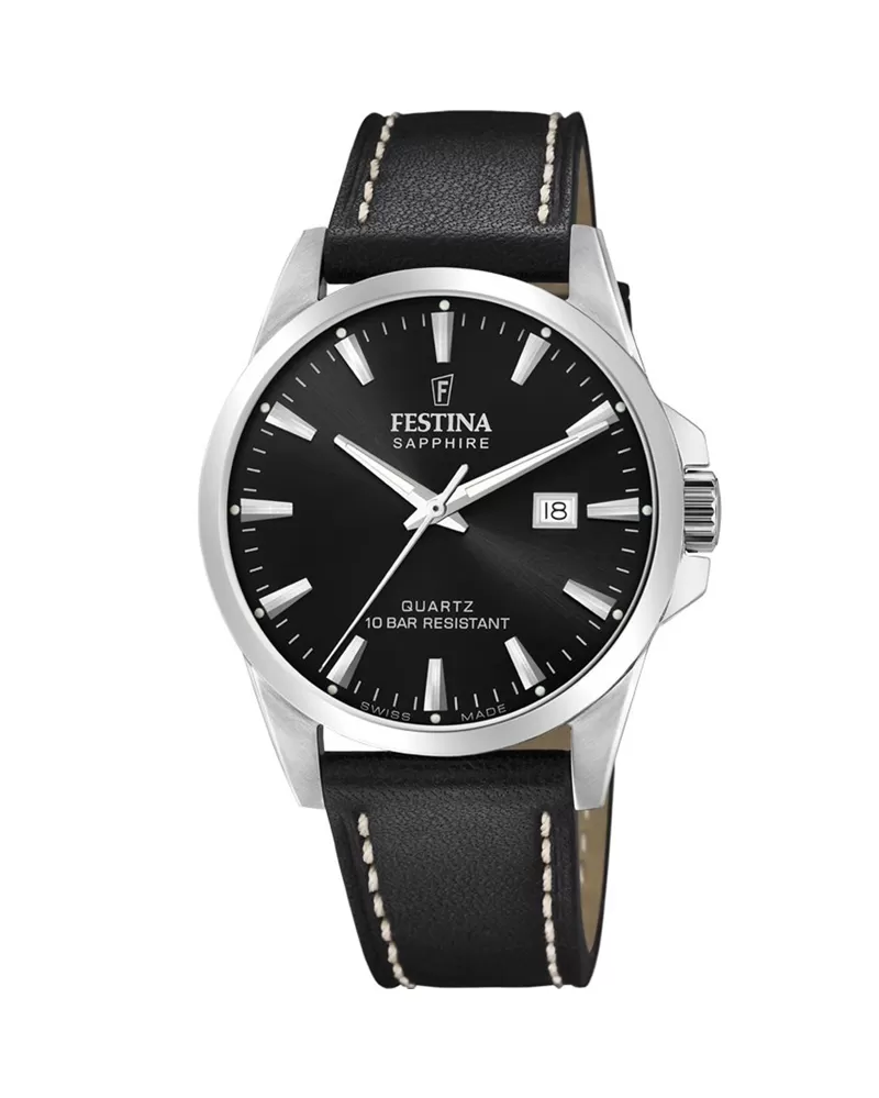 Krásne, jednoduché a veľmi elegantné hodinky Festina s oceľovým puzdrom zaujmú praktickú a veľmi decentnú stránkou, ktorú môžu ponúknuť. Hodinky sú veľmi prehľadné a obsahujú dátum, ktorý je na pozícii troch hodín. Maximálna pohodlnosť vám zaručí kožený remienok precízne prešívaný po stranách.