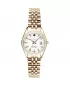 Dámske náramkové hodinky Napájanie z batérie Strojček MIYOTA GN12 Priemer puzdra 28,0 mm Puzdro v tvare kruhu Oceľové púzdro Zlatavá farba púzdra Oceľový ťah Zlatavá farba ťahu Ručičkový ciferník Biela farba ciferníka Ciferník s dvanástimi indexmi Materiál skla - minerálne sklo Odolné proti vode počas plávania Dátum