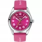 Detské náramkové hodinky Napájanie z batérie Strojček SEIKO Y121F Priemer púzdra 32,0 mm Puzdro v tvare kruhu Oceľové puzdro Strieborná farba puzdra Ružová farba ťahu Ručný ciferník Ružová farba ciferníka Ciferník s arabskými číslicami Materiál skla - minerálne sklo Vodeodolný pri plávaní