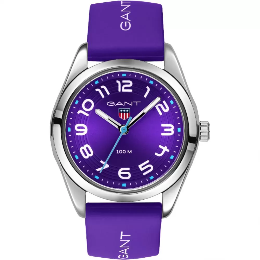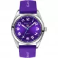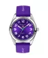 Detské náramkové hodinky Napájanie z batérie Strojček SEIKO Y121F Priemer púzdra 32,0 mm Puzdro v tvare kruhu Oceľové puzdro Strieborná farba puzdra Fialová farba ťahu Ručný ciferník Fialová farba ciferníka Ciferník s arabskými číslicami Materiál skla - minerálne sklo Vodeodolný pri plávaní