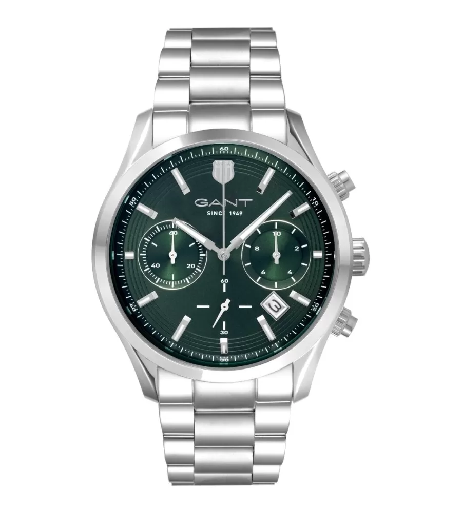 Gant P206004 sú pánske hodinky z Serie Prestige s funkciou chronografu, vybavené vysokovýkonným časom merania v druhom režime. Puzdro na rezanie z nehrdzavejúcej ocele má priemer 43 mm a hrúbku 11 mm, čo poskytuje robustný, ale stále elegantný vzhľad. Diama je zelená, textúrovaná, so striebornými luminiscenčnými indexmi a rukami pre ľahké čítanie a horšie svetlo. Po 4 a 5 hodinách je dátum dátumu, je tu tiež minútová mierka a chronografické skládky pre presné časové časti.