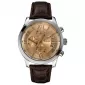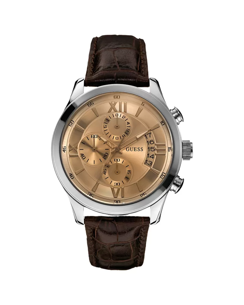 Hodinky Guess W0192G1 majú puzdro z nerez ocele a kožený remienok. Ciferník okrúhleho tvaru v zlatej farbe zobrazuje nielen čas, ale aj dátum a stopky.