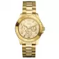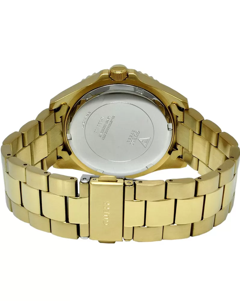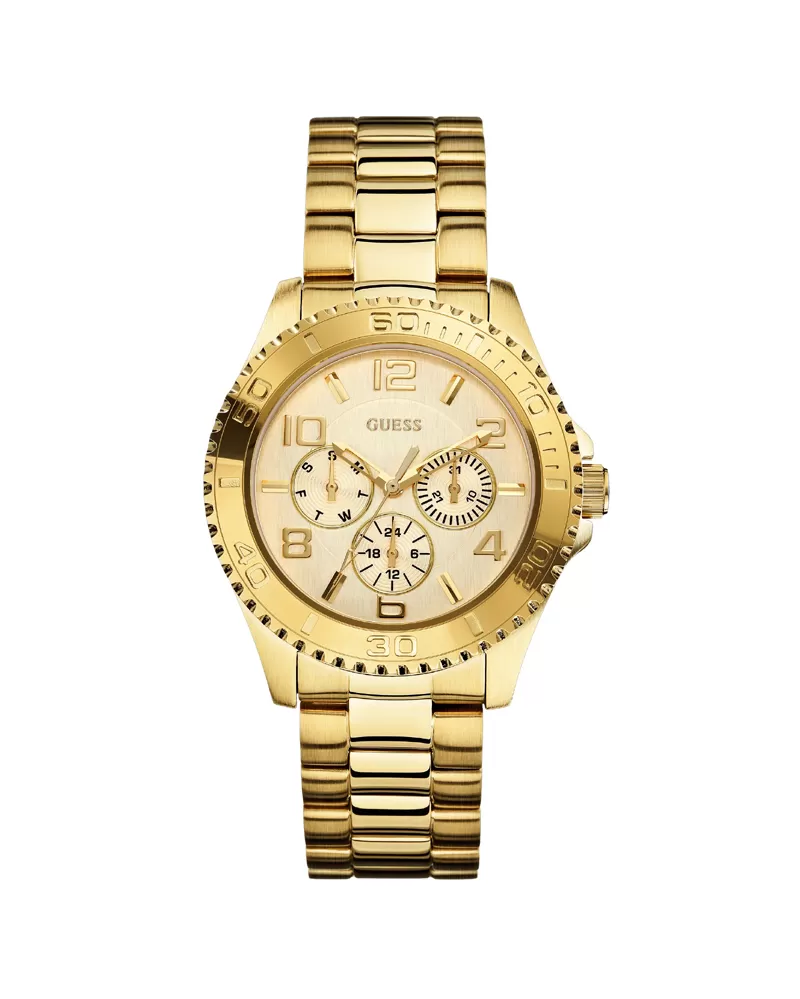 Hodinky Guess W0231L2 majú púzdro a remienok z pozlátenej nerez ocele. Ciferník okrúhleho tvaru v zlatej farbe zobrazuje nielen čas, ale aj dátum, deň v týždni a 24-hodinový ciferník.