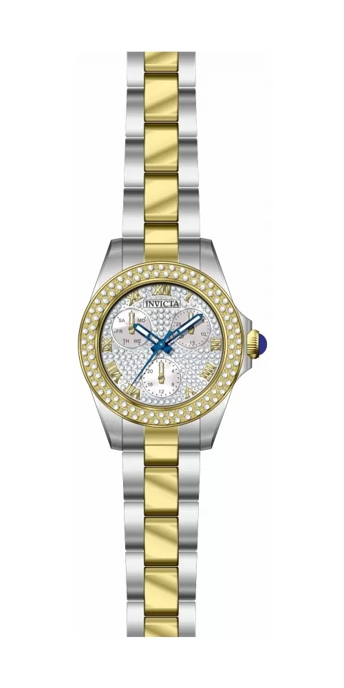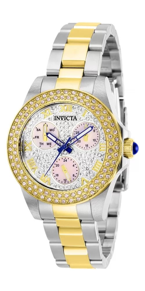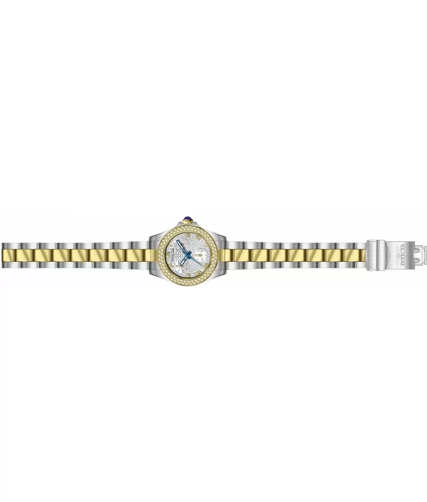 Tento model je plný lesku, ktorý tak milujete. Dámske náramkové hodinky sú vyrobené z vysoko kvalitnej nerezovej ocele, ktorá je miestami ošetrená PVD povrchovou úpravou vo farbe žltého zlata. Dominantou je okrúhle puzdro, ktoré je precízne okolo celého obvodu vysadené zirkónmi v briliantovom bruse v dvoch radoch. Puzdro má k dispozícii kvalitný japonský strojček Seiko VH68, ktorý Vás nikdy nenechá v štichu. Číselník je tiež bohato vysadený zirkónmi a dopĺňajú ho modré ručičky a rímske číslice.
