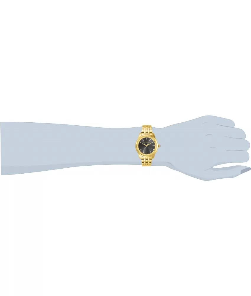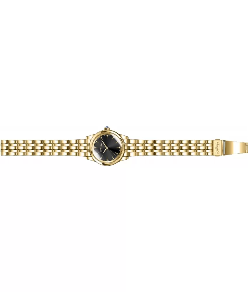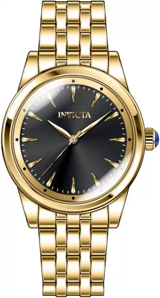 Dámske hodinky v tradičnom prevedení sú vyrobené z vysoko kvalitnej nerezovej ocele, ktorá je ošetrená PVD povrchovou úpravou vo farbe žltého zlata. Okrúhle púzdro skrýva japonský strojček Seiko PC21 a batérií so životnosťou dvoch rokov. Prehľadný číselník v čiernej farbe má k dispozícii iba elegantné ručičky a indexy hodín. Ako výrazný prvok je u tohto modelu skrutkovacia korunka, ktorá je zvýraznená modrým kameňom. Vodotesnosť u tohto modelu je 100M, čo je štandard tejto značky.