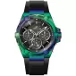 Neprehliadnuteľný model dámskych hodiniek zaujme každého kto sa vo Vašom okolí objaví. Okrúhle púzdro je vyrobené z vysoko kvalitnej nerezovej ocele, ktorá je ošetrená PVD povrchovou úpravou v zaujímavom dúhovom prevedením. Puzdro poháňa spoľahlivý japonský strojček Seiko VH63 a batéria s dvojročnou životnosťou. Minerálne sklo chráni prehľadný číselník, ktorý má k dispozícii dátum a dni v týždni. Celý model dopĺňa príjemný silikón v čiernej farbe.