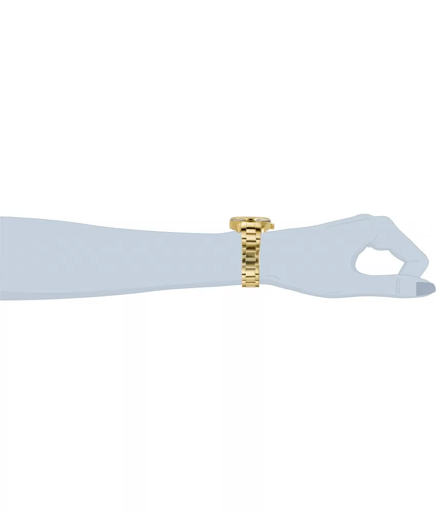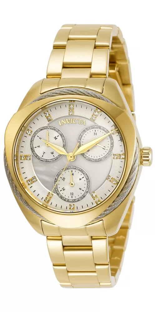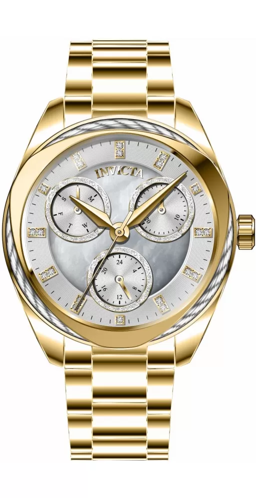 Dámske náramkové hodinky sú vyrobené z vysoko kvalitnej nerezovej ocele, ktorá je ošetrená PVD povrchovou úpravou vo farbe žltého zlata. Hodinky sú vybavené japonským strojčekom Seiko VH68 a batériou so životnosťou dvoch rokov. Perleťový číselník je zdobený zirkónmi v briliantovom bruse, ktoré sú vsadené namiesto indexov hodín. Kamienky dopĺňajú elegantné ručičky, dátum a dni v týždni.