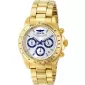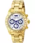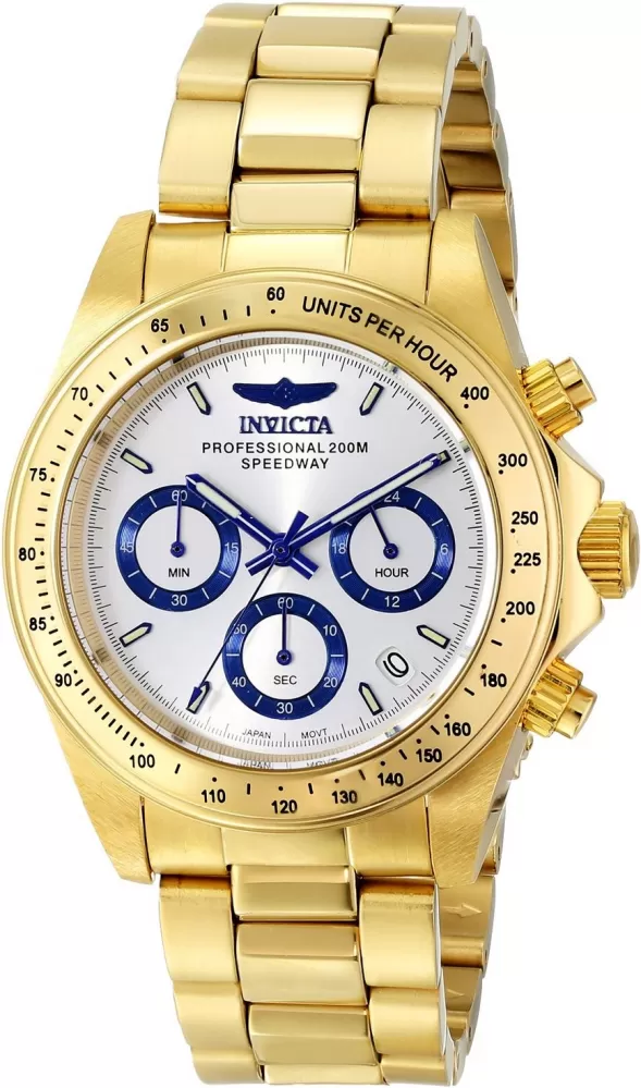 Dámske, športové hodinky sú vyrobené z vysoko kvalitnej nerezovej ocele, ktorá je ošetrená PVD povrchovou úpravou vo farbe žltého zlata. Guľaté puzdro je zvýraznené tachymetrickou lunetou a spoľahlivým, japonským strojčekom. Minerálne sklíčko chráni biely číselník, ktorý dopĺňajú modré aplikácie vo forme chronografu a dátumu. Čo Vás určite prekvapí je kvalitná vodotesnosť 200M.
