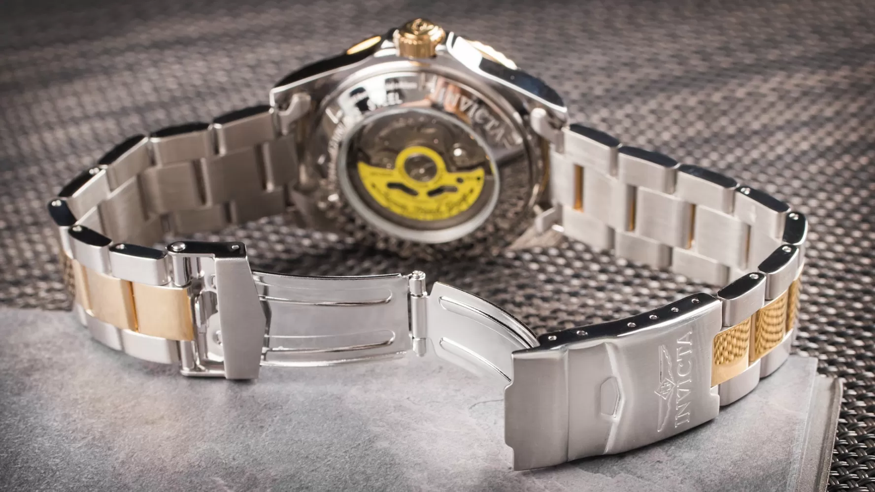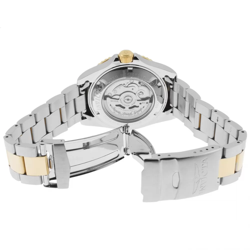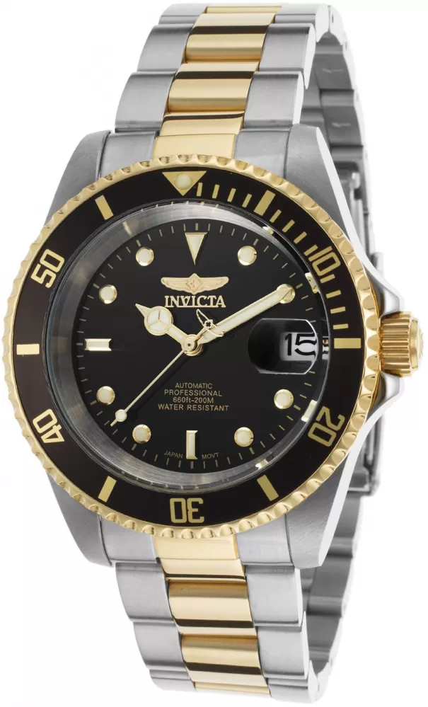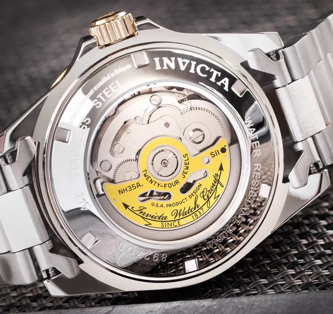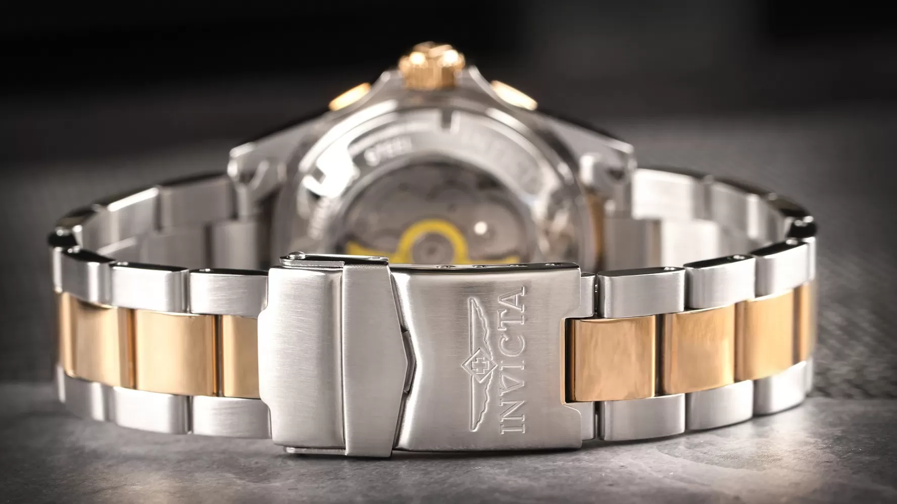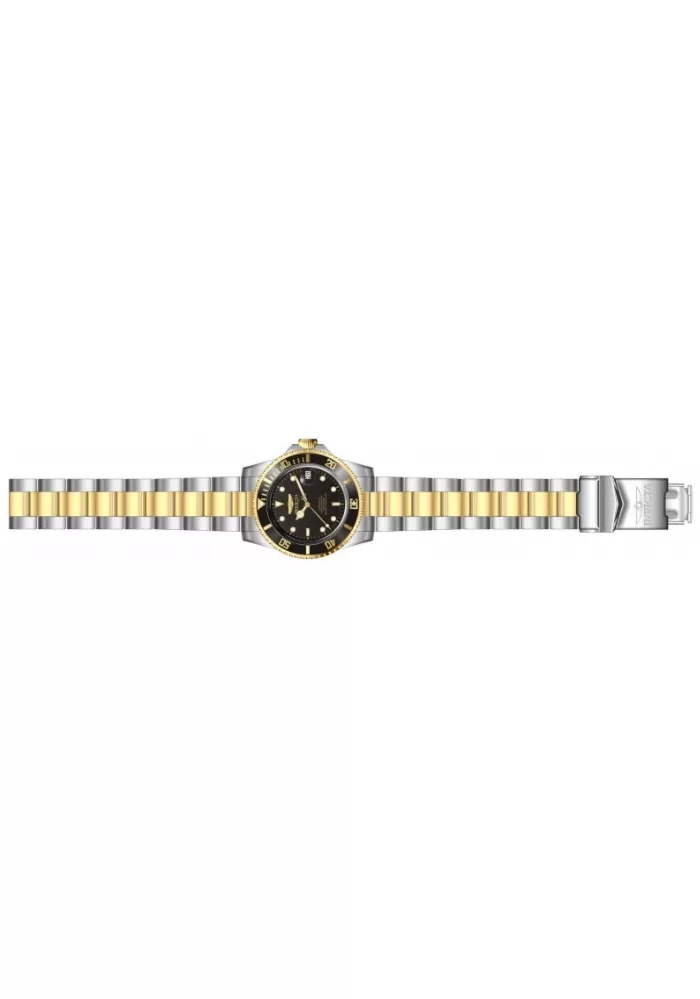 Elegantný pánsky automat je vyrobený z vysoko kvalitnej nerezovej ocele, ktorá je miestami ošetrená PVD povrchovou úpravou vo farbe žltého zlata. Okrúhle púzdro je vybavené mechanickým strojčekom s automatickým náťahom Seiko NH35 s rezervou chodu 41h, 21.600 BPH (3Hz). Puzdro zdobí jednosmerná, minútová luneta s arabskými číslicami. Veľmi prehľadný číselník v čiernej farbe má k dispozícii dátum, umiestnený na pozícii troch hodín a výrazné ručičky a indexy hodín s luminiscenčnou vrstvou.