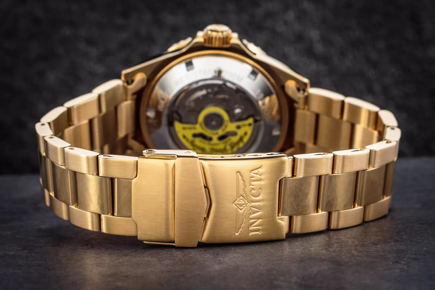 Elegantný model pre mužov je vyrobený z kvalitnej nehrdzavejúcej ocele, ktorá je ošetrená povrchovou úpravou PVD vo farbe žltého zlata. Okrúhle puzdro je vybavené mechanickým strojčekom s automatickým náťahom. Seiko NH35 s rezervou chodu 41 h, 21 600 BPH (3 Hz). Puzdro je tiež zvýraznené jednosmerným rámom v čiernej farbe. Ciferník má dátum na pozícii tretej hodiny a nepochybne ručičky s indexmi potiahnutými luminiscenčnou vrstvou.