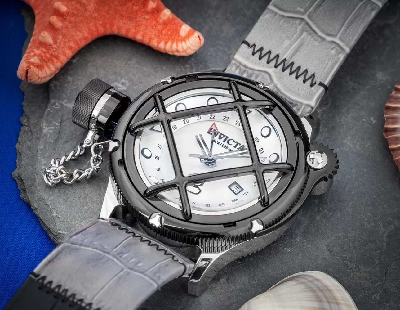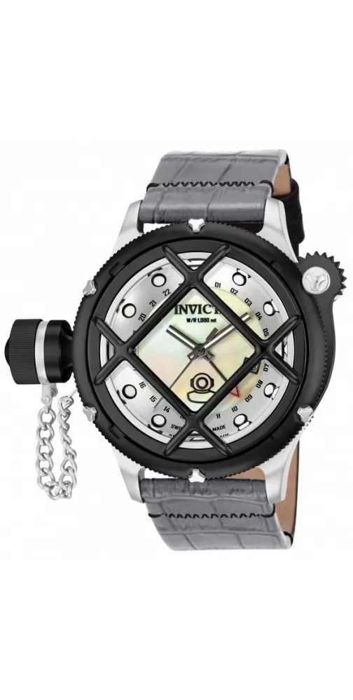 Pánske hodinky Invicta Russian Diver 18589 sú veľmi štýlový kúsok s masívnou korunkou, ktorý bude imponovať každému mužovi so slabosťou pre veľké hodinky. Puzdro je opatrené masívnou dymu s ozdobnou retiazkou a čiernou oceľovou lunetou. Ciferník hodiniek je perleťový, bez číslic. Remienok je vyrobený z kože s kovovou prackou.