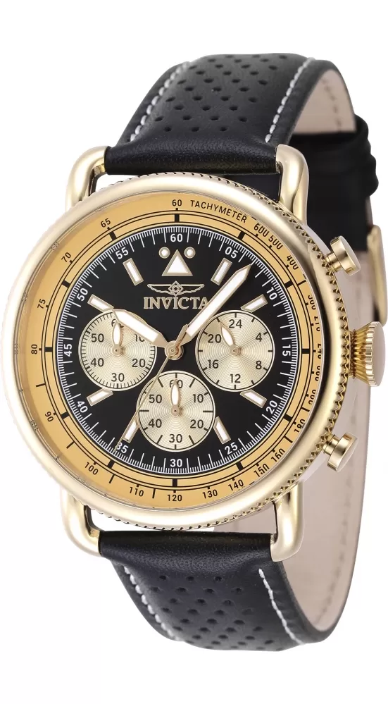 Exkluzívny pánsky model je vyrobený z vysoko kvalitnej nerezovej ocele, ktorá je ošetrená PVD povrchovou úpravou vo farbe žltého zlata. Masívne okrúhle púzdro poháňa japonský strojček Seiko VD54 a batéria s dvojročnou životnosťou. Číselník chráni minerálne sklo. Obsahuje tachymetrickú lunetu, chronograf a samozrejme ručičky a indexy hodín, ktoré sú opatrené luminiscenčnou vrstvou. Model dopĺňa príjemný kožený remienok s oceľovou prackou. Vodotesnosť tohto model je 50M.