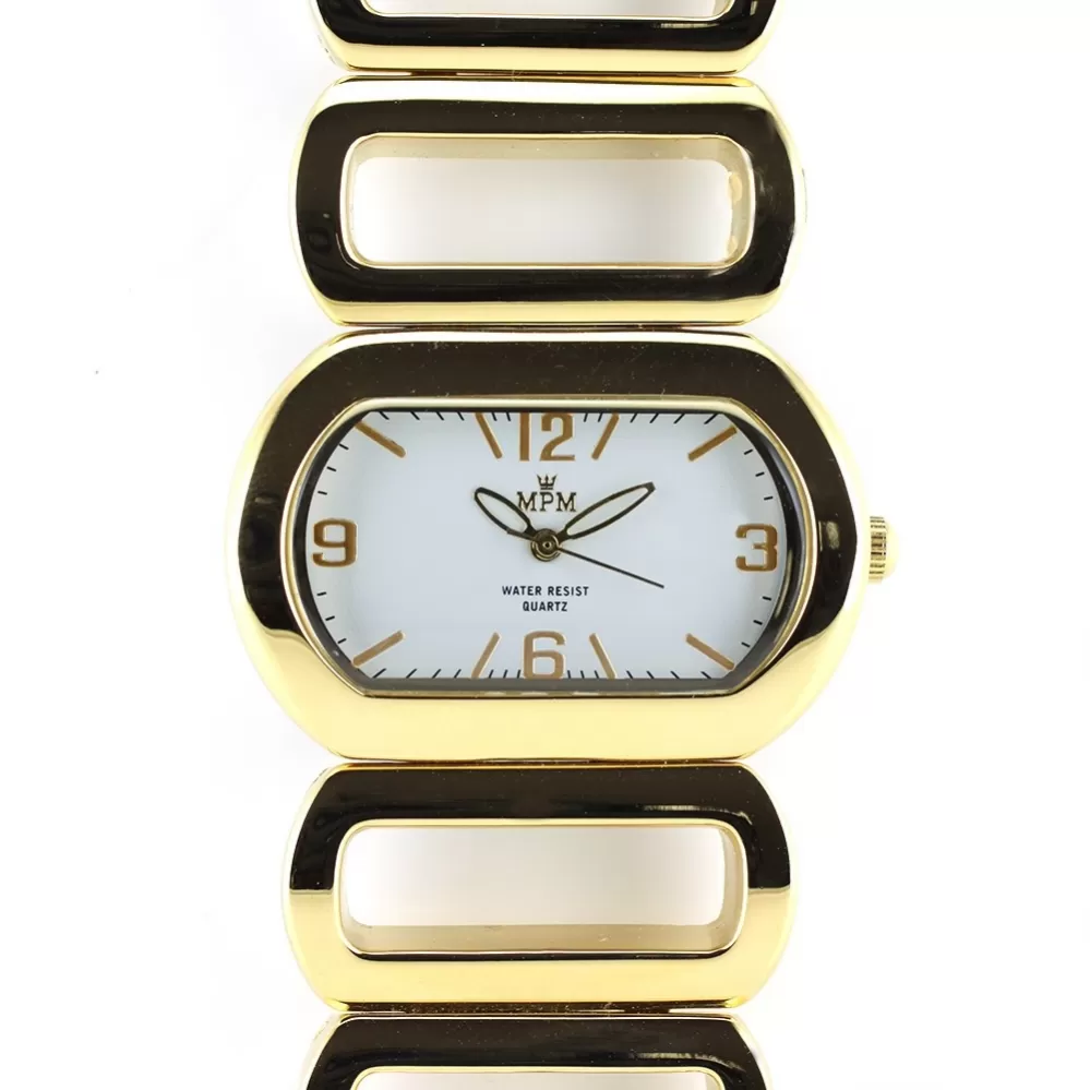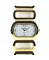 Náramkové hodinky oválneho tvaru s bielym ciferníkom.