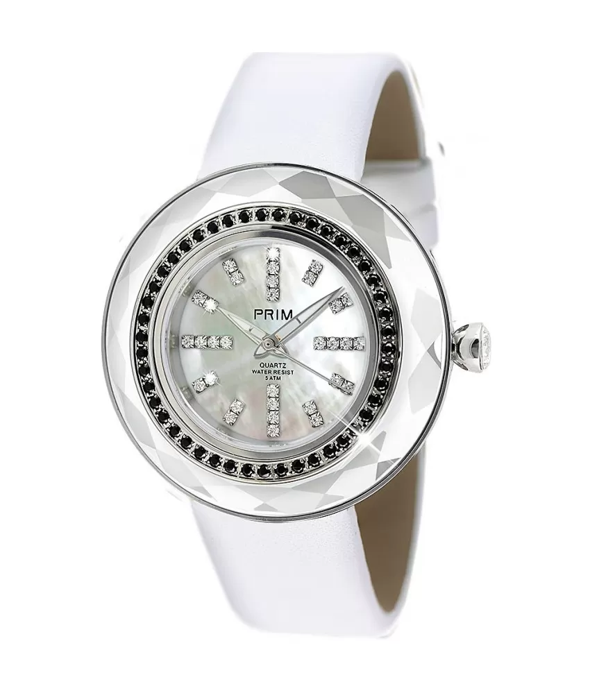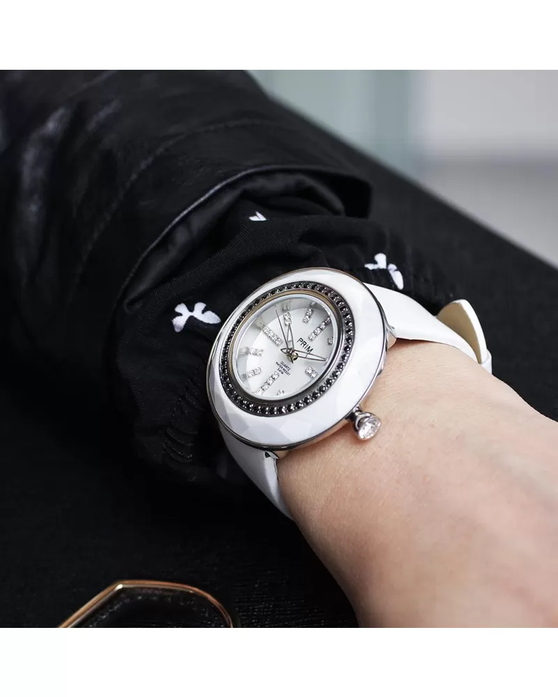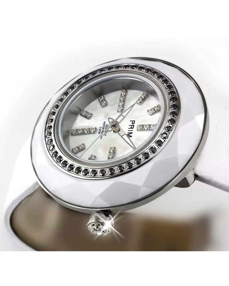 Luxusné dámske náramkové hodinky značky Prim Vás očarí svojim dizajnom. Hodinky sú ladené do bielej farby so žiarivými trblietavými kamienkami, ktorými je vysadené puzdro a sú aj na miesto indexov. Okružie hodiniek Prim je vyrobené z ručne brúseného prírodného Onyxu, ktoré má jedinečnú štruktúru, čo robí hodinky úplne úchvatné!