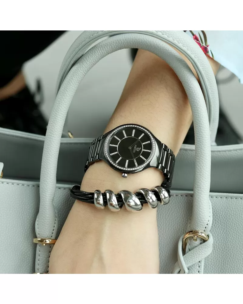 Tieto krásne hodinky Prim zaujmú svojim vzhľadom každú elegantnú ženu. Remienok aj púzdro hodiniek Prim je vyrobené z keramiky v bielej farbe. Puzdro hodiniek je osadené záživými krištáľmi, ktoré pochádzajú z českej výroby. Na čiernom ciferníku vynikajú indexy, ktoré sú tiež osadené krištáľmi.