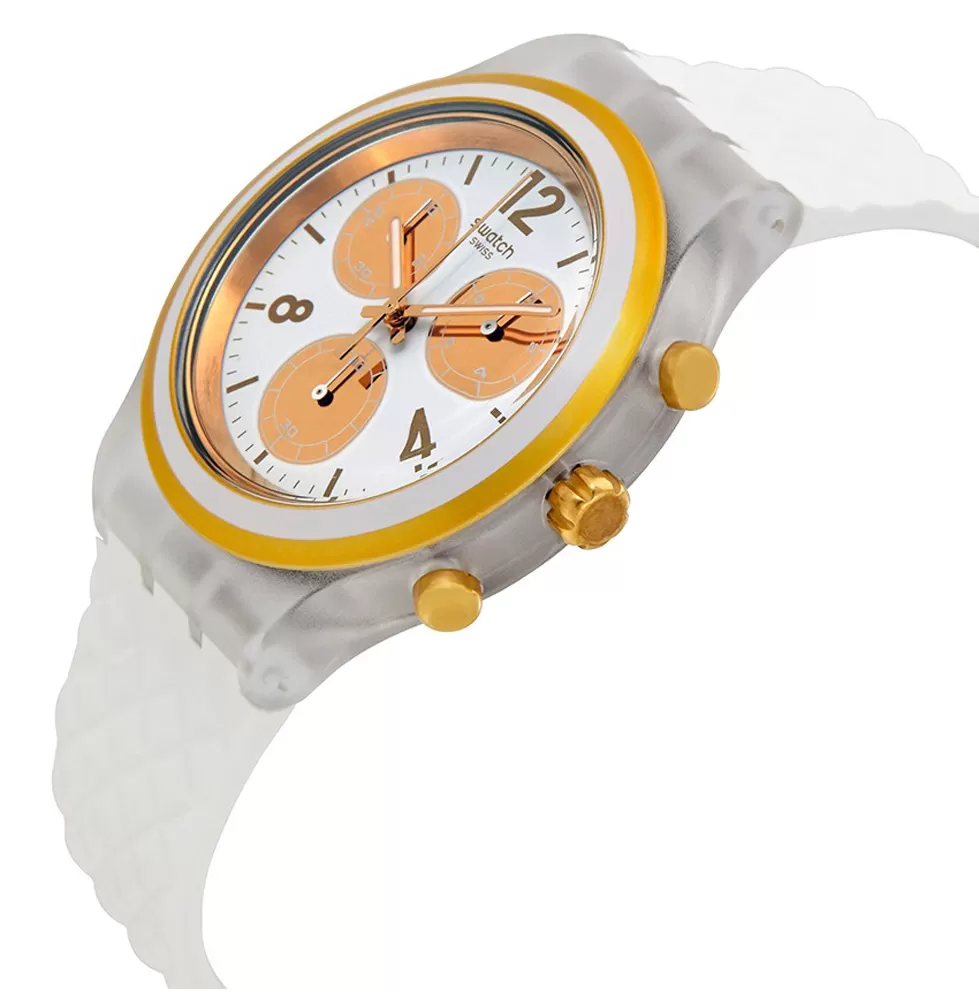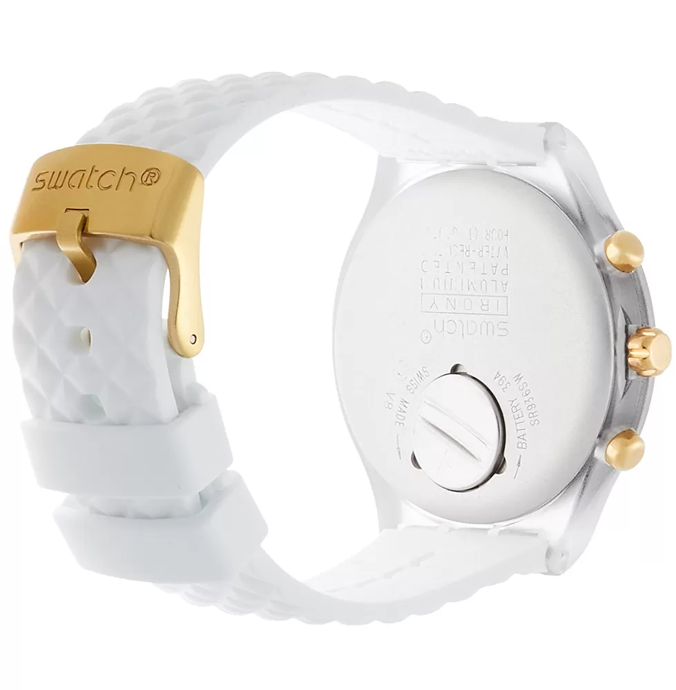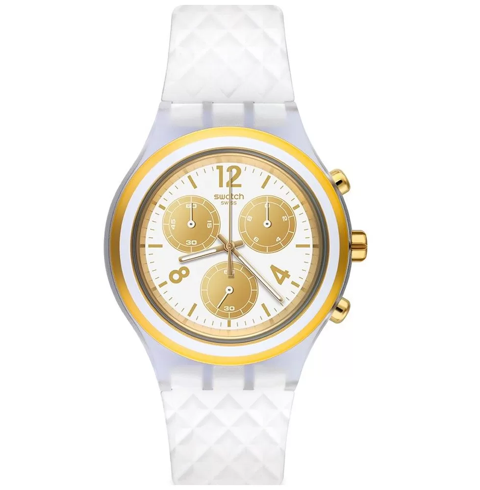 Hľadáte elegantné a zároveň športové hodinky? Práve pre Vás je tu model Elegolden od značky Swatch! Veľmi elegantné hodinky, ktoré budú zdobiť vaše zápästie ako šperk a zároveň si s nimi môžete ísť zabehať. Hodinky sú vyrobené v kombinácii plastového priehľadného puzdra a silikónového prepracovaného remienka v bielej farbe. Ciferník v zlato-bielej farbe je originálne spracovaný a krásne na ňom vyniknú indexy hodín a číslice. Obsahuje chronograf a stopky. S týmto modelom Vás zaručene nikto neprehliadne.