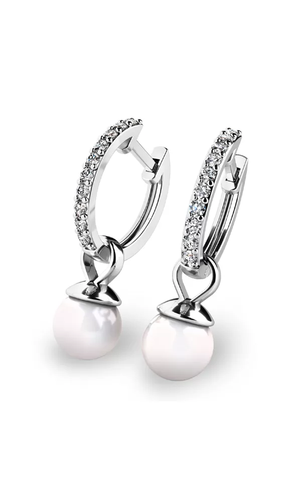 Náušnice kruhy patří mezi velmi oblíbený šperk. Náušnice jsou vhodné pro každodenní nošení i na společenské akce a sluší každé ženě. Tento model je zdoben dvaceti zirkony a dvěmi přírodními kulatými perlami. Zirkony jsou v briliantovém brusu, díky kterému dokonale odráží světlo a neuvěřitelně září. Vsazování kamenů provádějí naši nejzkušenější mistři zlatníci ručně pod mikroskopem s přesností na 0,01mm a proto nehrozí vypadnutí kamínků jako to bývá u strojně vyráběných náušnic. Tyto nádherné náušnice jsou vyrobeny z bílého čtrnáctikarátového zlata - 585/1000 v lesklé povrchové úpravě.