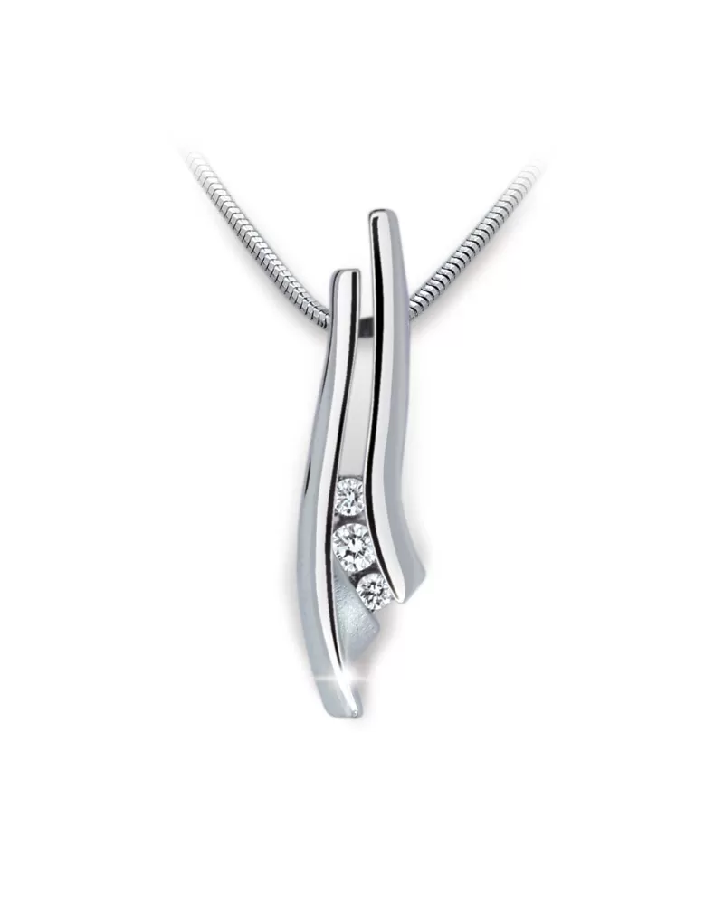 Prívesok s tromi bielymi zirkónmi z bieleho štrnástich karátového zlata 585/000 v lesklej povrchovej úprave. Prívesok je možné kúpiť s retiazkou, ktorá je vyobrazená na doplňujúcej fotografii.