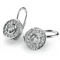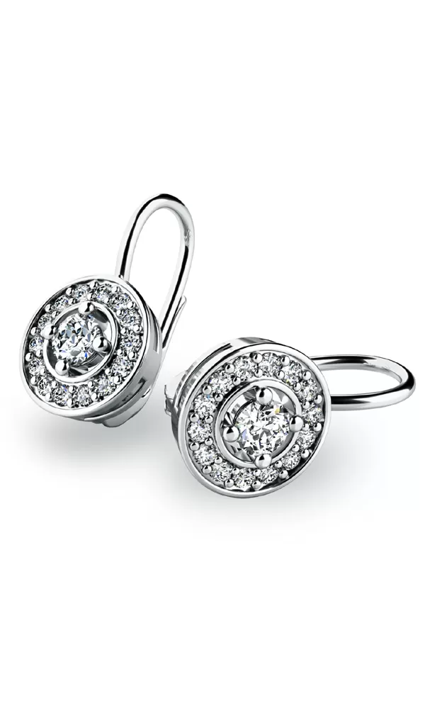 Nádherný model klasických náušníc zdobí tridsať oslňujúcich zirkónov briliantového brusu. Tieto žiarivé náušnice sú vyrobené z bieleho štrnásťkarátového zlata - 585/1000 v lesklej povrchovej úprave. Väčší stredový zirkón obklopuje štrnásť menších zirkónov v každej náušnici a opticky ich zväčšuje lesklý lem okolo zirkónov. Vďaka precíznemu brúsu zirkóny získali dokonalú brilanciu. Skvele odráža svetlo a september! Náušnice sa vyrábajú aj v žltom zlate a zapínajú sa na klapku. Vsadzovanie zirkónov vykonávajú naši najskúsenejší majstri zlatníci ručne pod mikroskopom s presnosťou na 0,01mm a preto nehrozí vypadnutie kamienkov ako to býva u strojne vyrábaných náušníc.